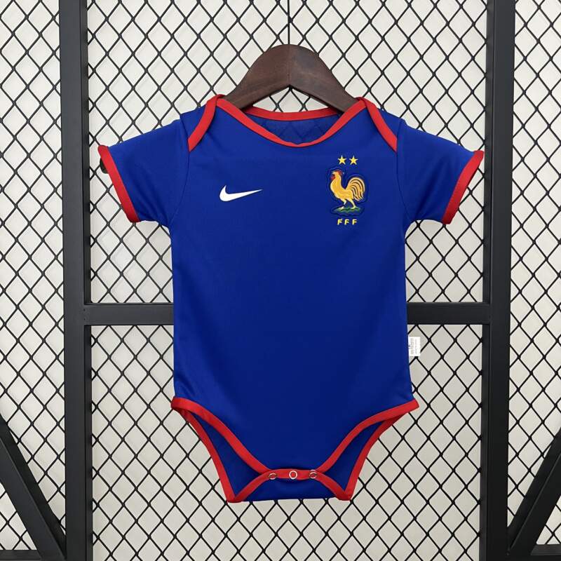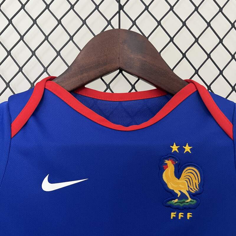 El body está inspirado en la primera equipación de Francia 2024-2025, con los colores icónicos 🇫🇷 y el gallo dorado 🐓 en el pecho, asegurando que tu pequeño luzca como un verdadero hincha.