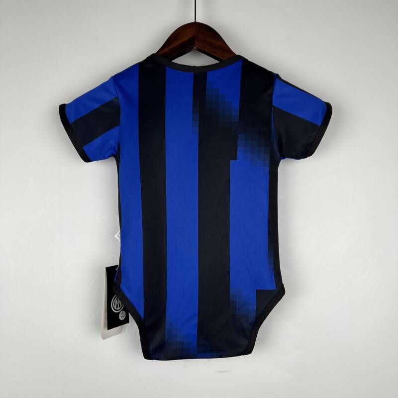 Combina los icónicos colores del Inter Milán, el azul y el negro, en rayas verticales y degradados, creando una apariencia dinámica y moderna. El body también presenta el logo de la marca en el pecho, un sello de calidad. Pero eso no es todo, ¡el gran escudo del Inter Milán, con su característica estrella encima, completa este diseño