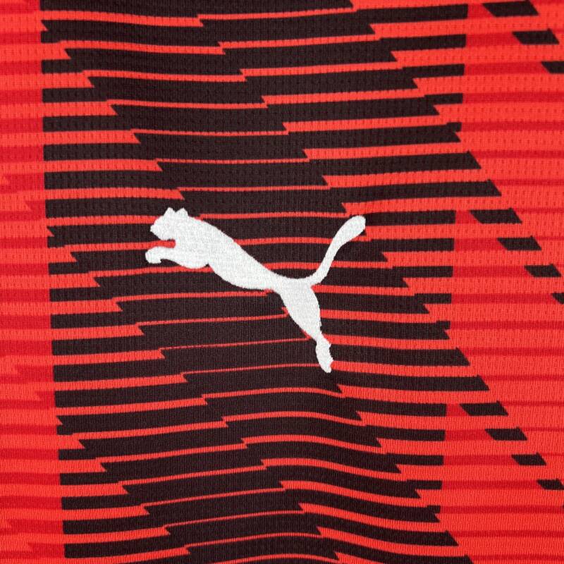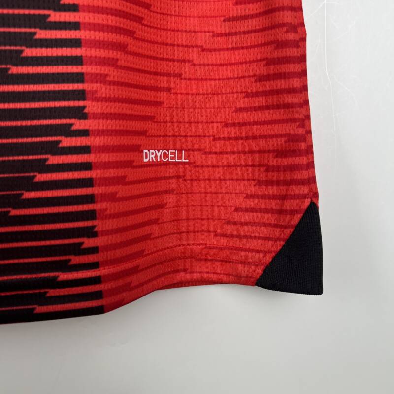 Combina los colores emblemáticos del AC Milan, el rojo y el negro, en un patrón de rayas verticales que le otorga un aspecto dinámico y moderno. El fondo espectacular resalta la grandeza del club. Además, la camiseta lleva el logo de la marca, el escudo del AC Milan y el patrocinador.