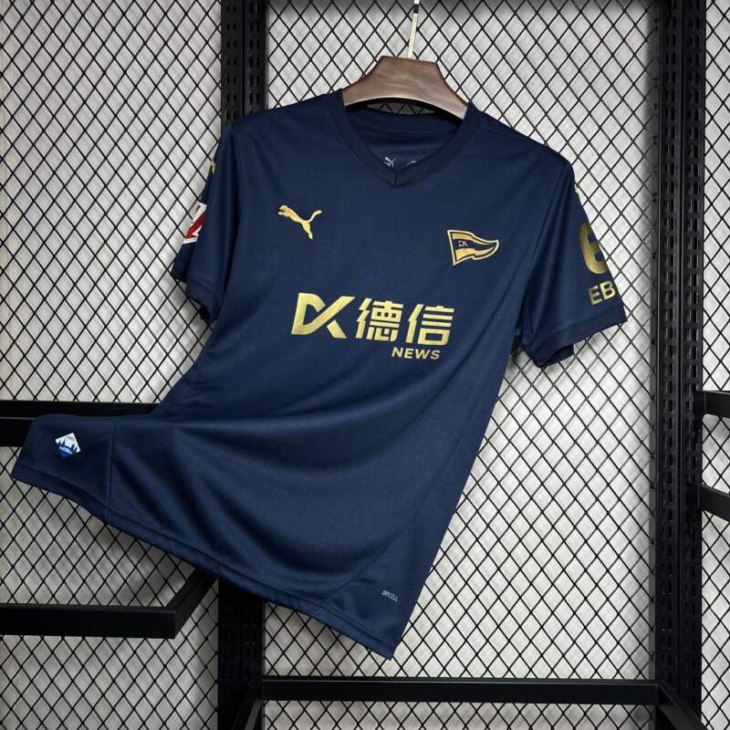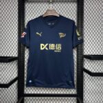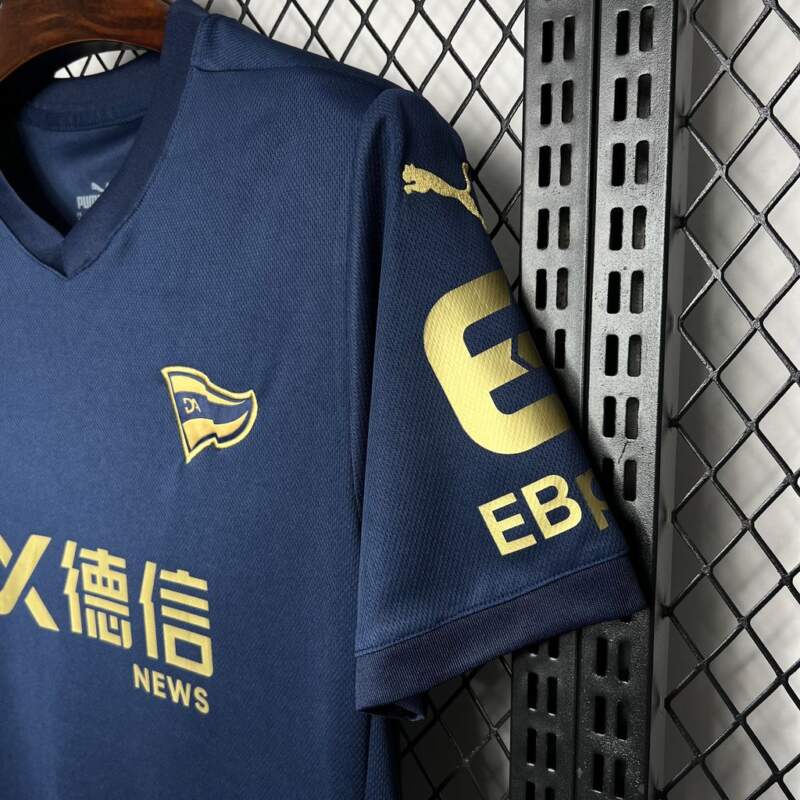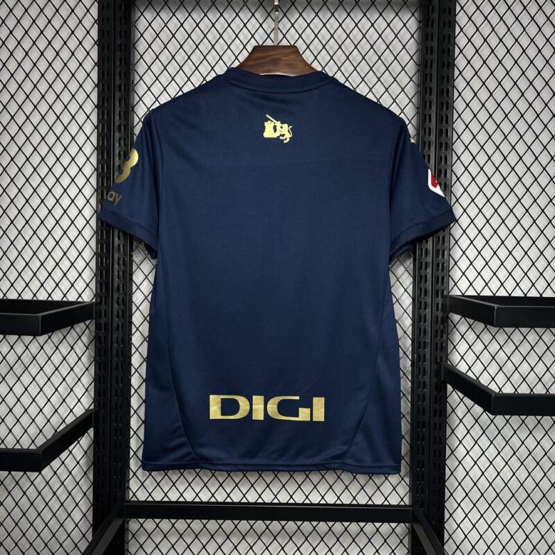 La Camiseta Alavés Tercera Equipación 2024-2025 destaca con su diseño en azul marino oscuro y detalles dorados, ofreciendo un estilo elegante y sofisticado que rinde homenaje a la región de Araba.