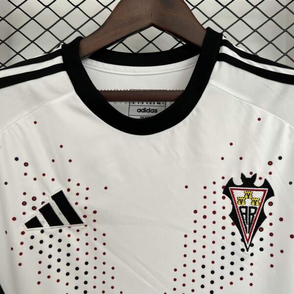 La Camiseta Albacete Primera Equipación 2025-2026 luce un diseño blanco con detalles negros en cuello y hombros, incorporando un patrón de puntos rojos en el pecho que aporta un toque moderno y dinámico. El escudo del club y el logo del patrocinador destacan en contraste, resaltando la identidad del equipo.