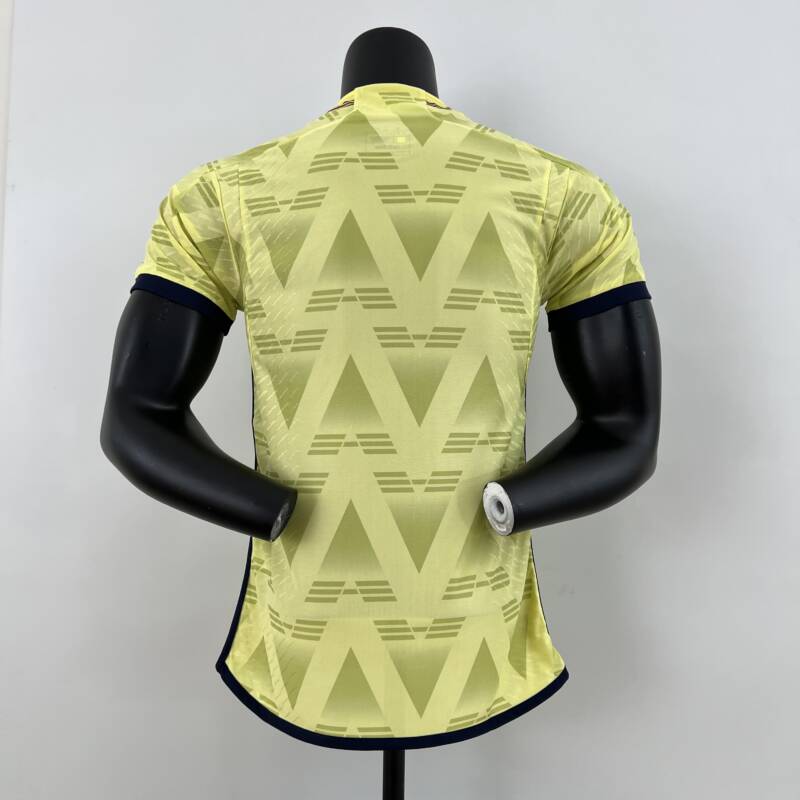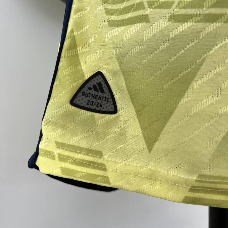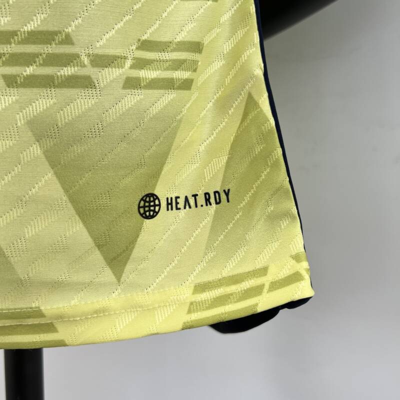 La camiseta Arsenal segunda equipación 2023/2024 Versión jugador tiene un diseño impresionante que combina el clásico estilo de Arsenal con un toque moderno. Con su vibrante color amarillo y detalles en negro y azul, además del estampado, la hacen elegante y llamativa. Lleva el emblemático escudo del equipo, el logo de la marca y el patrocinador en el pecho, lo que la convierte en una prenda que no pasará desapercibida. Además, el cuello redondo y las mangas cortas le dan un aspecto clásico y atemporal.