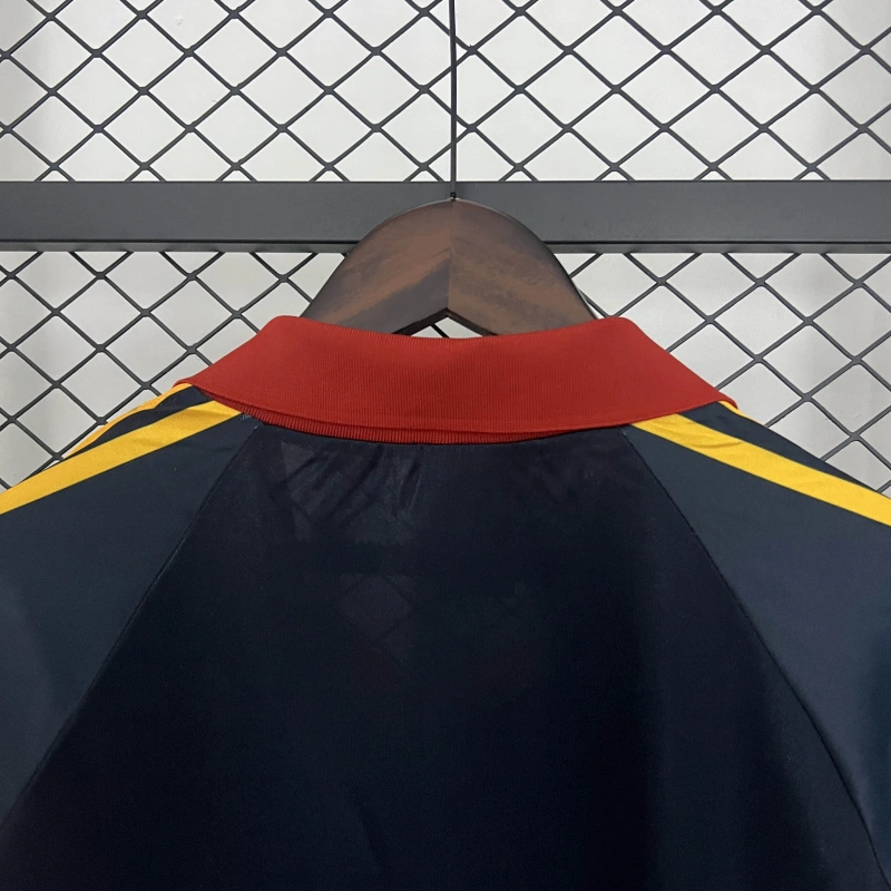 La Camiseta AS Roma Segunda Equipación Retro 1991-1992 🔵🔴🟡 es una pieza icónica que revive el espíritu de una de las épocas más memorables del club. Con un diseño en azul como base, destaca por sus detalles en rojo y amarillo, colores representativos de la Roma, que le otorgan un estilo inconfundible.