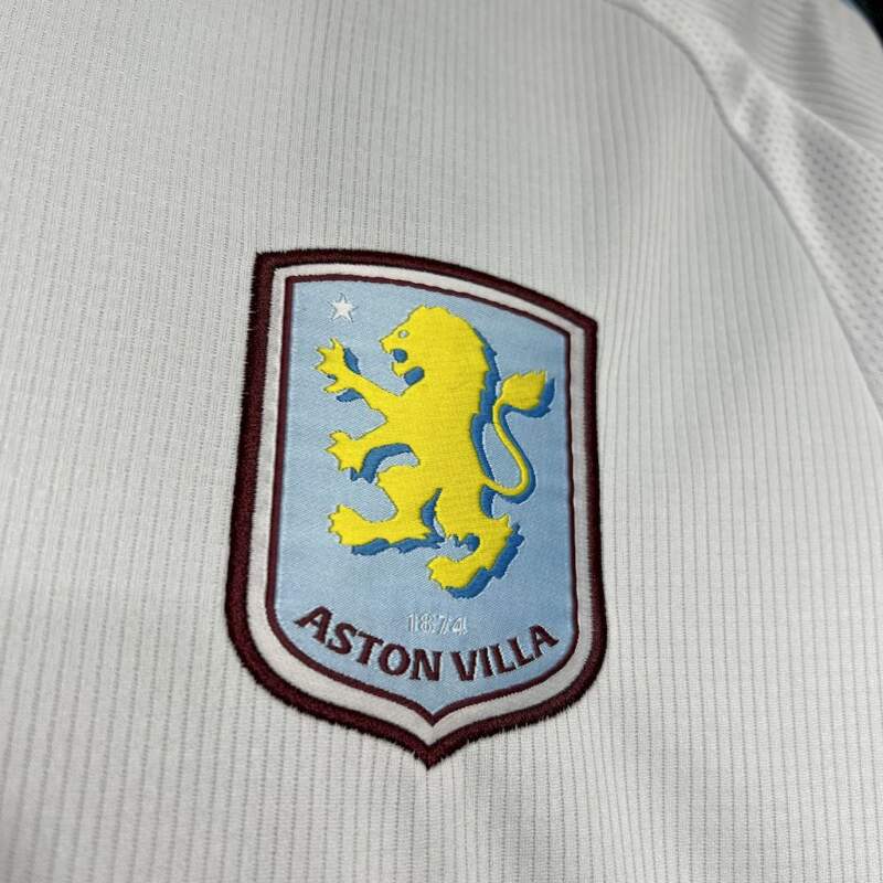 4. Logos y Patrocinadores: El escudo del Aston Villa 🦁 se encuentra en el lado izquierdo del pecho, representando el orgullo de pertenencia al club. El logo del patrocinador se sitúa de manera discreta, manteniendo la estética limpia del diseño.