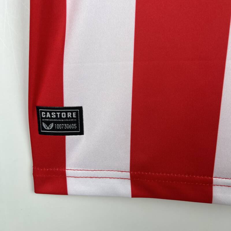 Combina los colores emblemáticos del club, el rojo y blanco en rayas verticales, con detalles en negro en el cuello y las mangas, añadiendo un toque de elegancia. Lleva el logo de Castore, su escudo y el patrocinador.