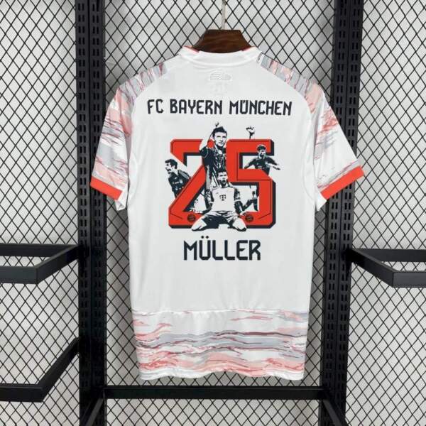 Homenaje especial: En la parte trasera luce el número 25 con ilustraciones icónicas de Thomas Müller, celebrando su legado con el club.