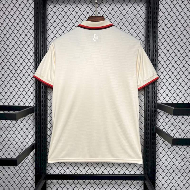 - Estilo y Versatilidad: Su elegante color beige-amarillo claro, combinado con logotipos granates y detalles en rojo, la hace perfecta tanto para el estadio como para el uso diario 🏟️👗
