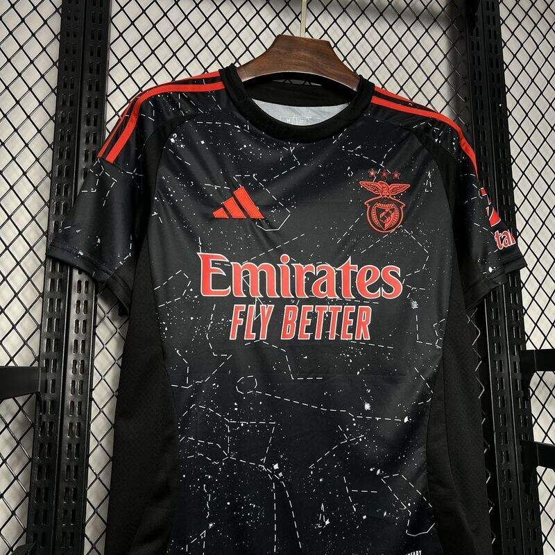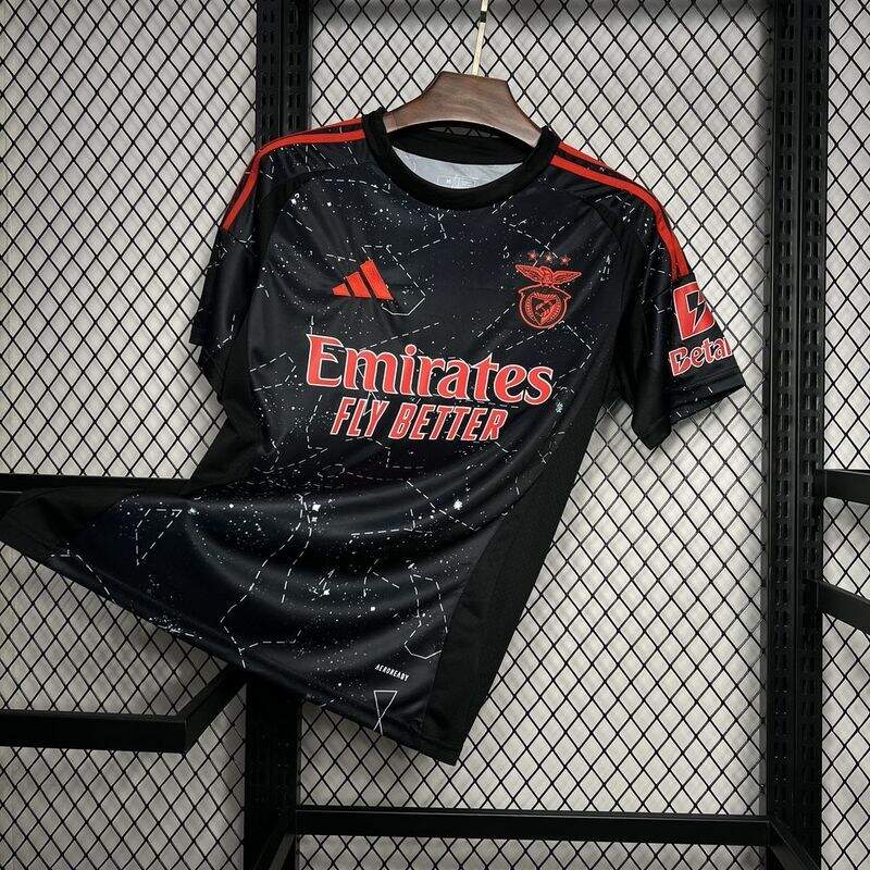 La Camiseta Benfica Segunda Equipación 2024-2025 se presenta en un elegante color negro 🖤 con impactantes detalles en rojo 🔴, creando un look moderno y llamativo para los aficionados del club.