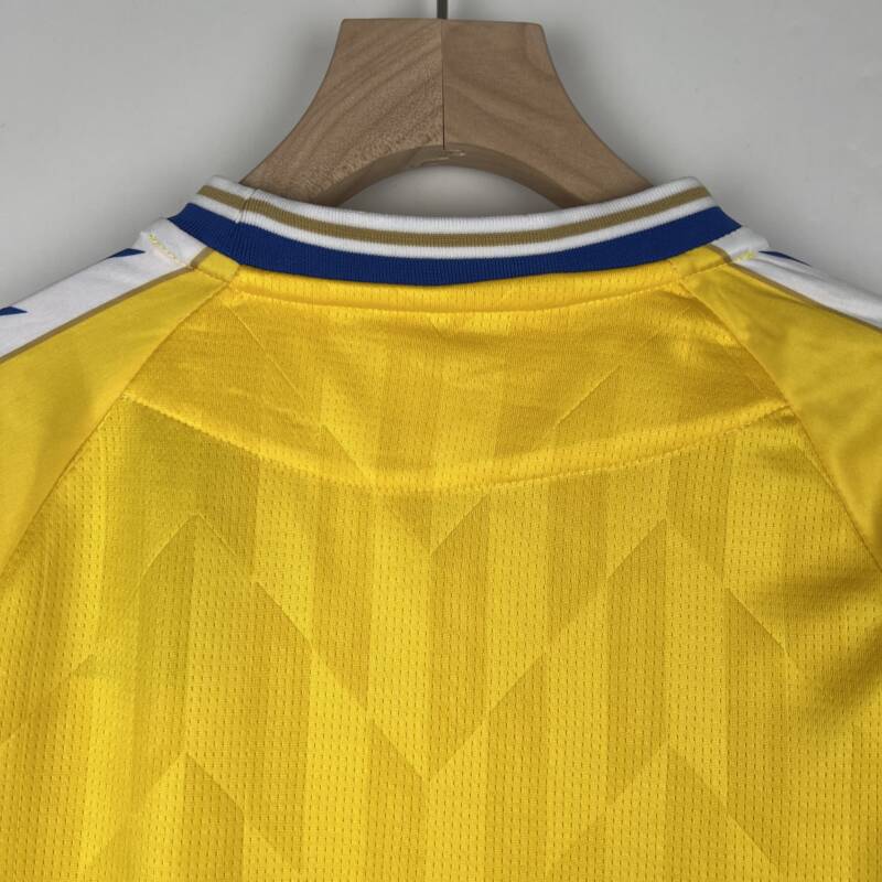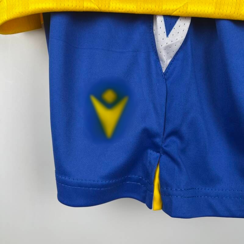 Combinando los vibrantes colores amarillo y azul, la camiseta destaca con detalles en dorado en el cuello y las mangas. Por otro lado, el pantalón corto predomina en un azul intenso, llevan el logo de Macron, el escudo y la publicidad.