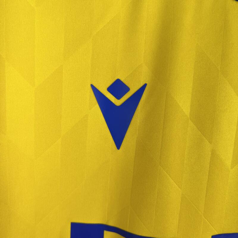 Combina el amarillo vibrante, símbolo del Cádiz CF, con detalles en blanco, azul y dorado, creando un aspecto impactante. En el pecho, se destaca el logo de Macron, el escudo del club y el patrocinador.
