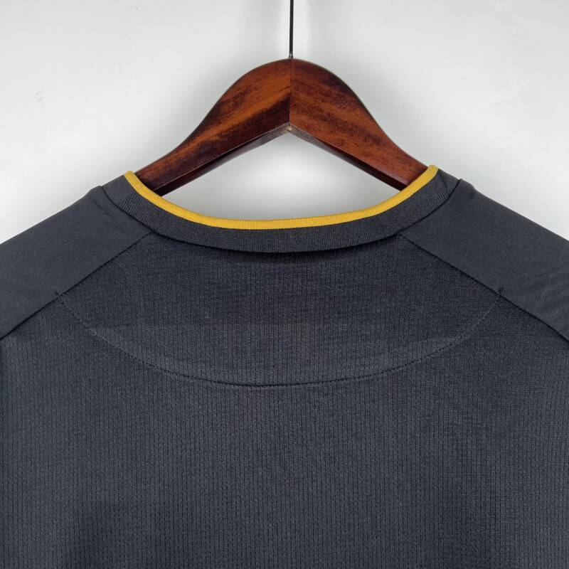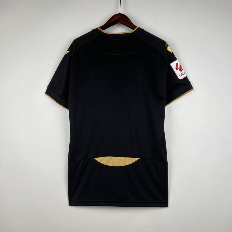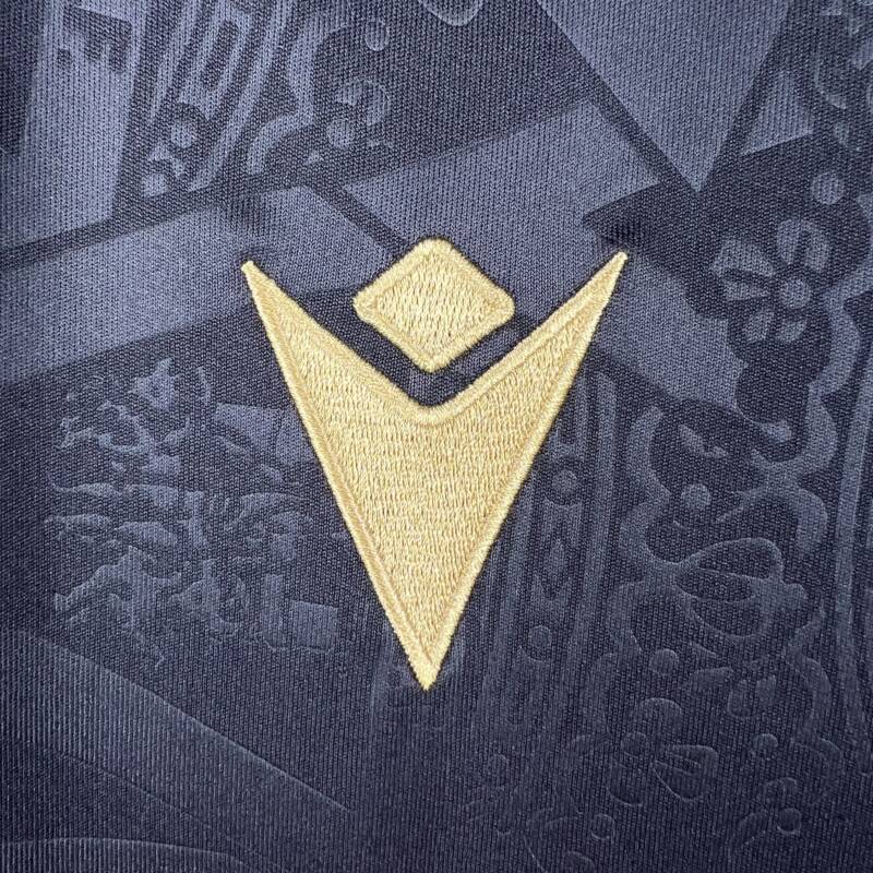 Combina a la perfección el negro y dorado, con un fondo llamativo que resalta la camiseta. Además, lleva el logo oficial de Macron, así como el escudo del club y su publicidad.