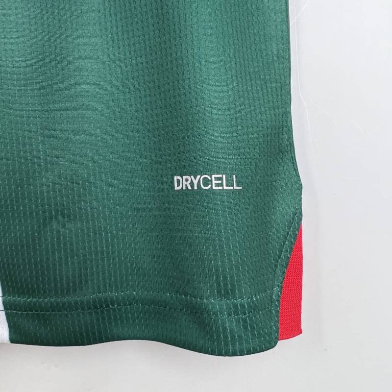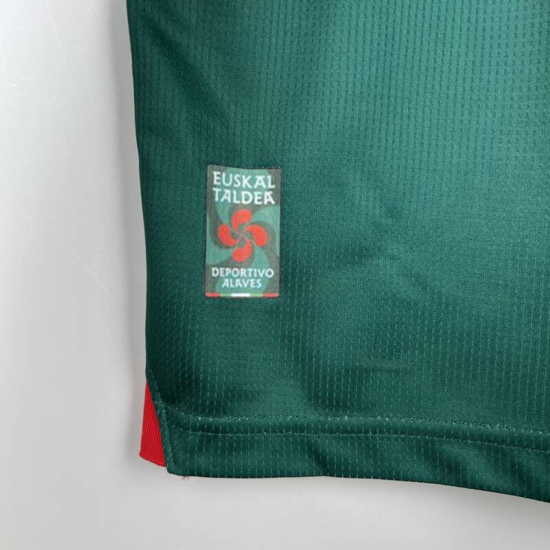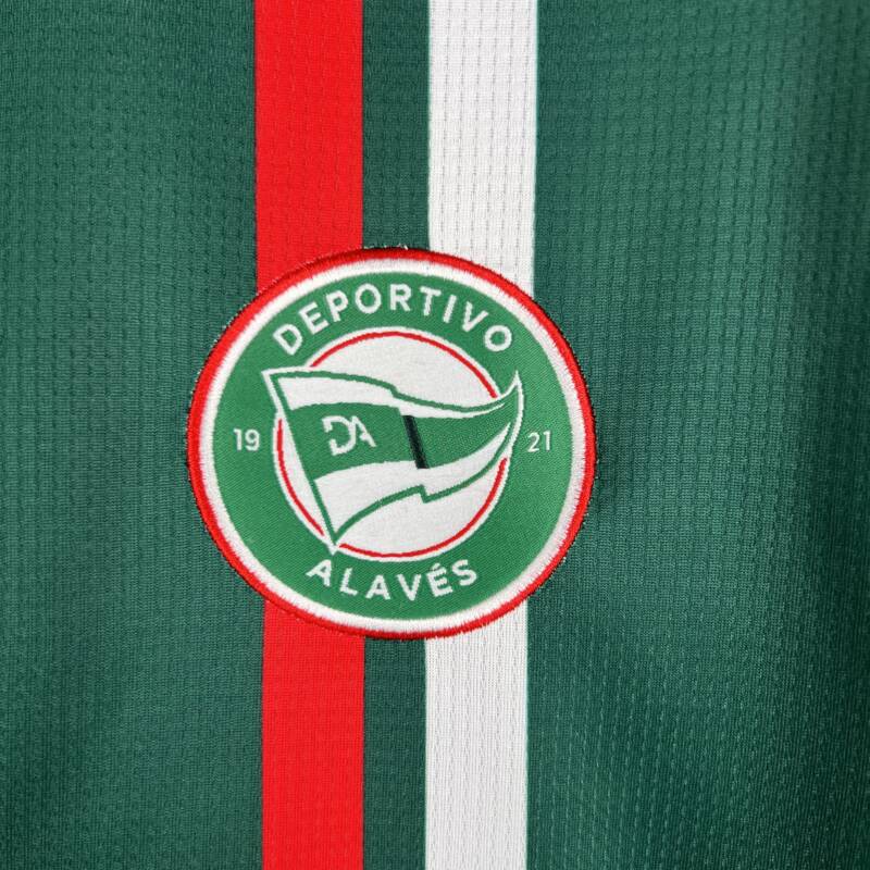 Con la segunda equipación Alavés, el verde de tonalidad predominante toma el centro del escenario, evocando la energía y vitalidad que caracterizan a este equipo. Las dos franjas verticales en blanco y rojo en el sector izquierdo añaden un toque de elegancia y contrastan a la perfección con el verde.