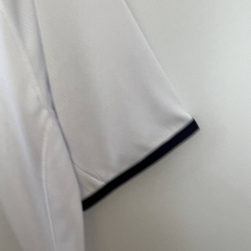 El blanco puro se ve realzado por un cautivador detalle de celeste que bordea uno de los lados de la camiseta, luce detalles de azul oscuro en las mangas, presenta el logo de Kappa, su gran escudo y el nombre del patrocinador.
