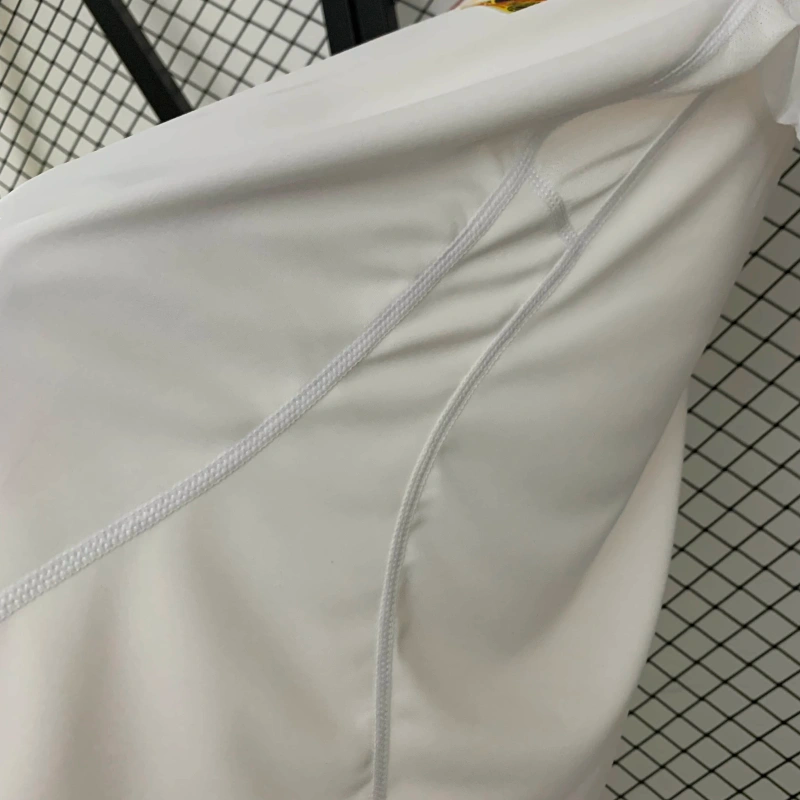 El color blanco predomina en toda la camiseta, ofreciendo una apariencia clásica y elegante que recuerda a los momentos más inolvidables del fútbol español.