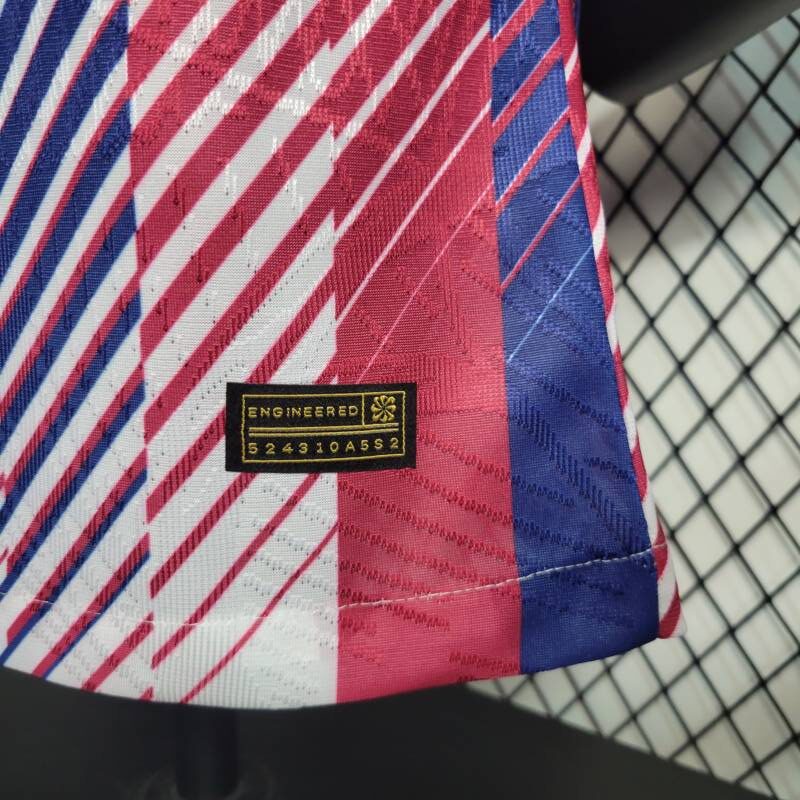 Combina los colores emblemáticos del FC Barcelona: blanco, azul y rojo, en un fondo que crea un impacto visual impresionante. Las líneas dinámicas y elegantes resaltan la energía y la determinación del equipo. Además, la camiseta cuenta con el icónico logo, el escudo del FC Barcelona y el patrocinador.