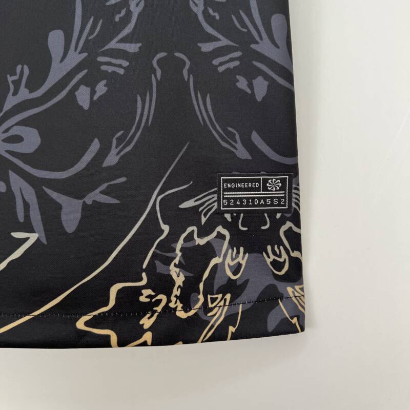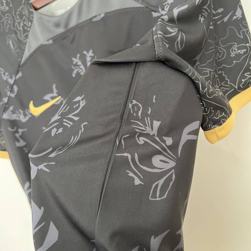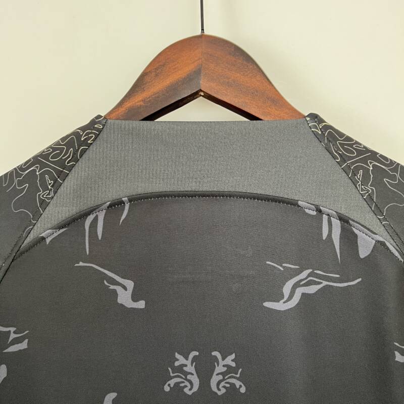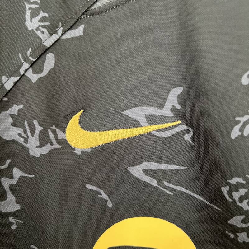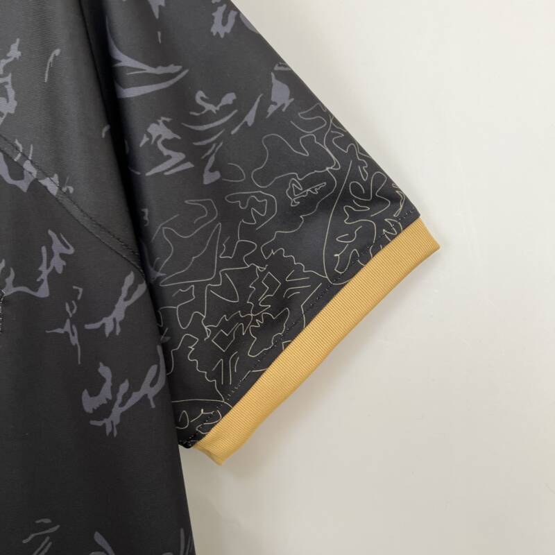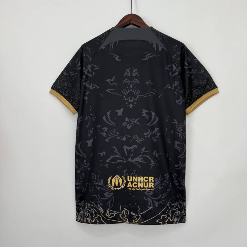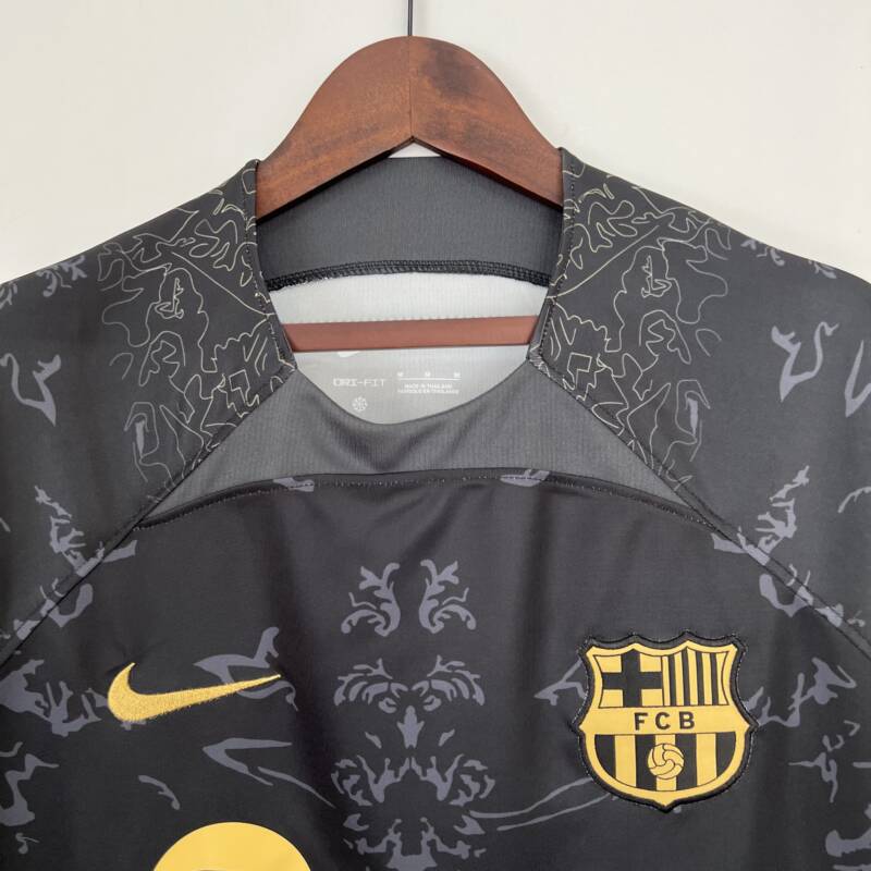 Presenta un diseño espectacular, viste el color negro con un estampado de fondo que combina de manera perfecta con el dorado en las mangas, lo que le da un toque de elegancia y estilo. El logo de la marca y el icónico escudo del equipo están presentes en el pecho bordado, asimismo, el patrocinador de Spotify.