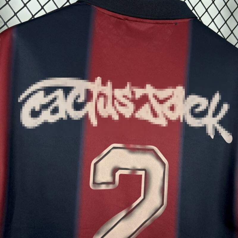 🔴🔵 Colores tradicionales del club, con franjas verticales en granate y azul marino intenso.