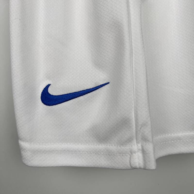 Predomina el color blanco en toda la prenda, incluyendo el pantalón corto, se combina con detalles en rojo y azul en las mangas. Lleva su emblemático escudo, el logo de la marca y el patrocinador.