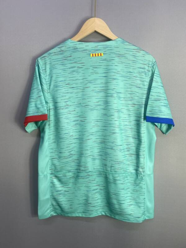 Como color predominante, tomará un tenue color turquesa que evoca la frescura y la vitalidad. Pero aquí viene la novedad que hace que esta camiseta sea única: ¡la inclusión de tonos tradicionales en los bordes de las mangas, los triángulos que decoran el cuello y las pequeñas líneas horizontales que se repiten en casi toda la tela! Este toque de herencia y modernidad en el diseño hará que destaques entre la multitud y demuestres tu apoyo inquebrantable al Barcelona.
