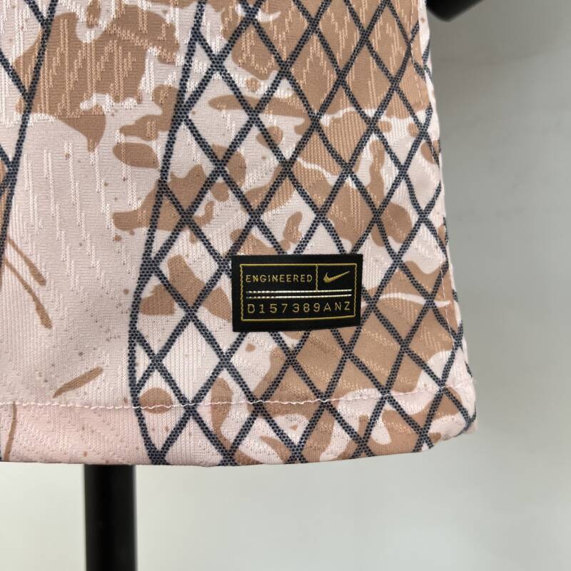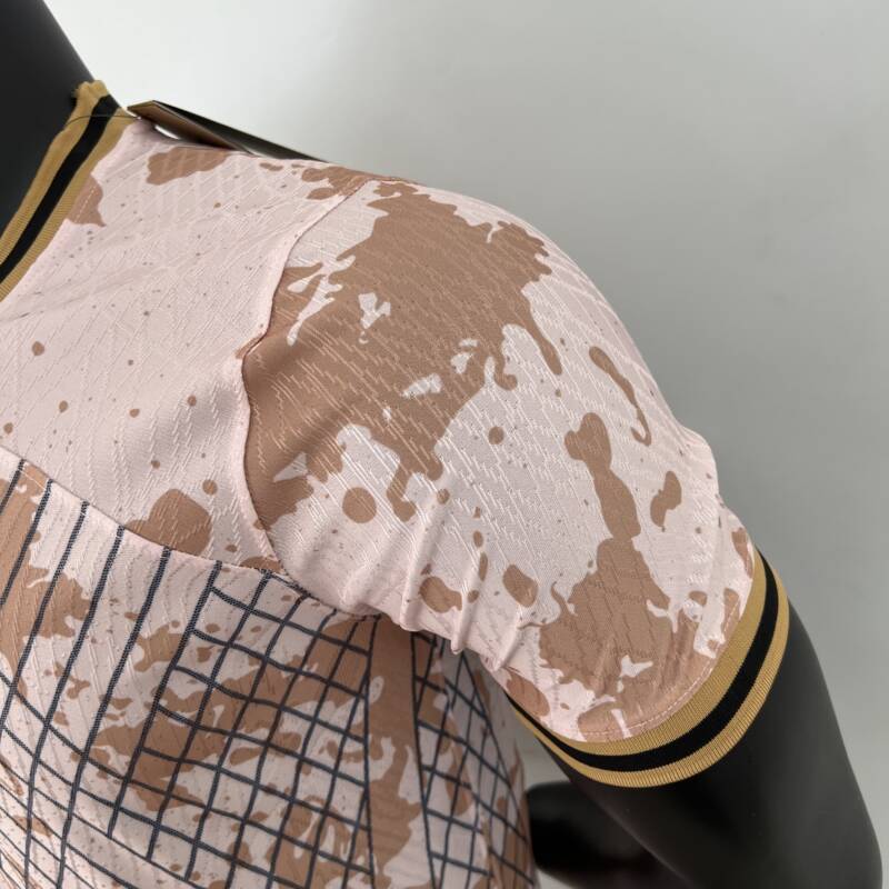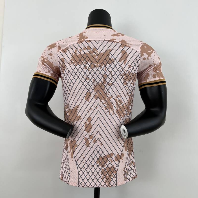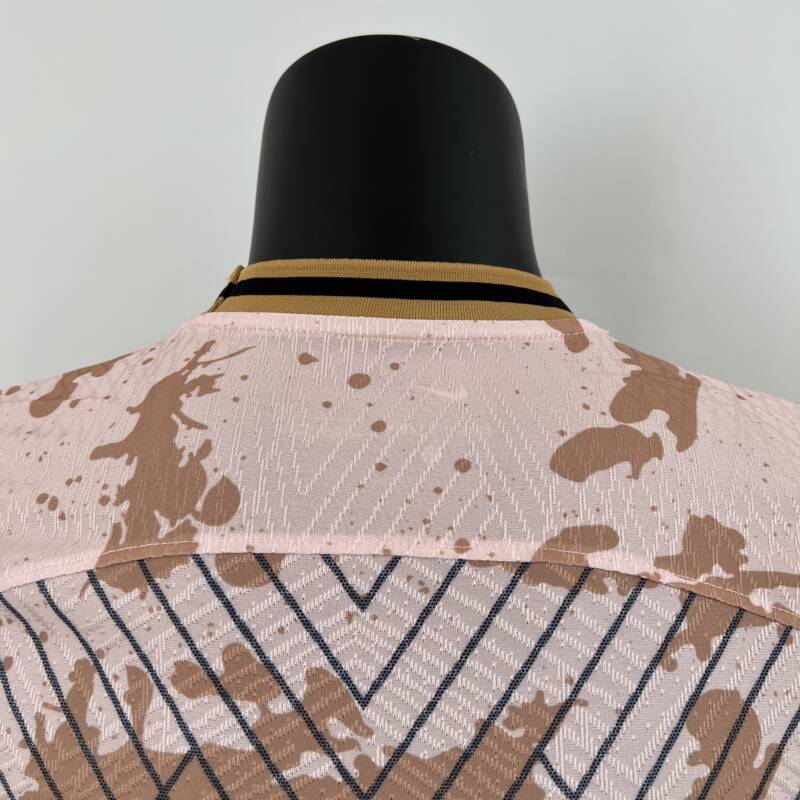 El diseño de la «Camiseta Inter de Milán edición especial 2023/2024» es una auténtica obra de arte. Combina el rosa claro con un patrón de manchas cafés y un estampado muy llamativo que simboliza la fuerza y ​​el espíritu del equipo. Los detalles de rombos en la parte delantera y trasera, junto con las rayas doradas y negras en el cuello y las mangas, agregan un toque de elegancia y sofisticación al diseño. El logo de la marca y el escudo del equipo en el pecho reflejan la verdadera identidad del Inter de Milán, lo que la convierte en una camiseta única.