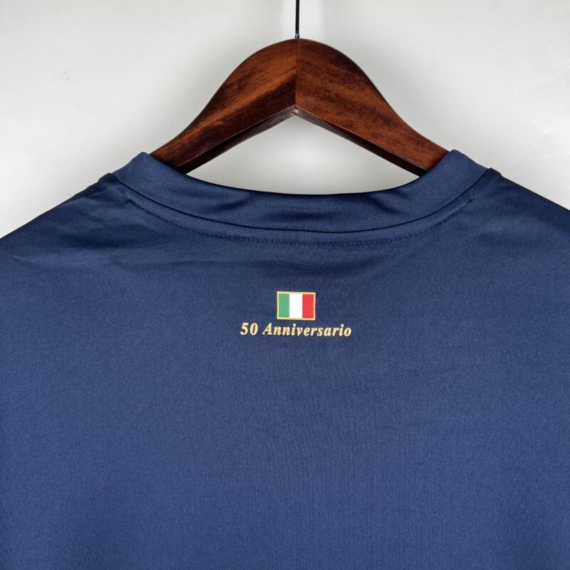 Aprovechando los 50 años del primer título de la liga, nuestra segunda equipacion Lazio es una verdadera obra de arte en términos de diseño. El azul, el color base, rinde homenaje a la rica historia del club. Lo que la hace aún más especial es el detallado tramado de rayas que adorna el frente de la camiseta. Este patrón evoca el legado de victoria y determinación del equipo, recordándonos las épicas hazañas que han marcado la historia del SS Lazio. Además, los colores de la bandera italiana que adornan los bordes de las mangas son un símbolo de la pasión y el orgullo nacional que esta segunda equipacion lazio representa.