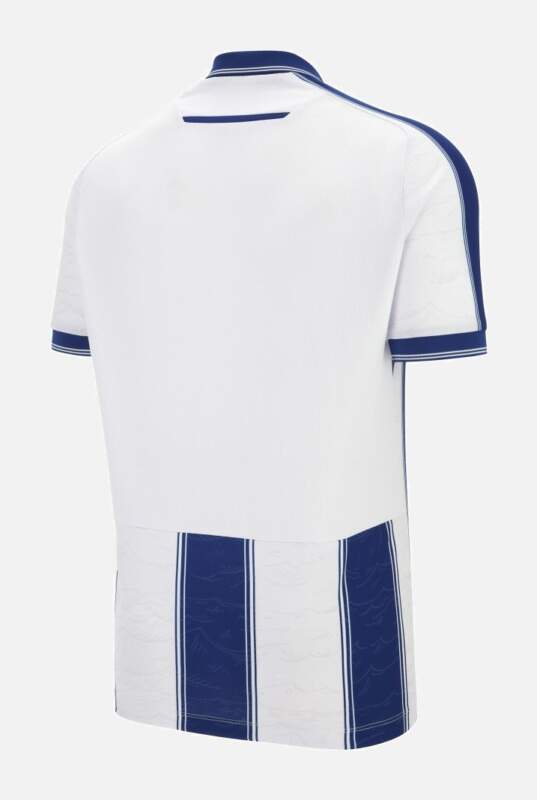 La Camiseta Levante UD Segunda Equipación 2025-2026 combina una base clara con tres bandas azul marino y finas rayas blancas, en tejido ligero y transpirable que refleja la fuerza del mar.