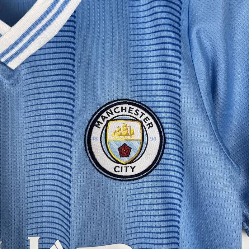 La Camiseta Manchester City 2023/2024 Niño Kids – Primera Equipación tiene un estilo retro que te encantará. Con una combinación de colores llamativa, combina el celeste con el blanco, con elegantes detalles en azul oscuro. Además, el pantalón corto, en un blanco predominante, completa el conjunto de manera perfecta. Ambas piezas lucen el logo de la marca y el gran escudo del Manchester City, brindando un toque de autenticidad y orgullo.