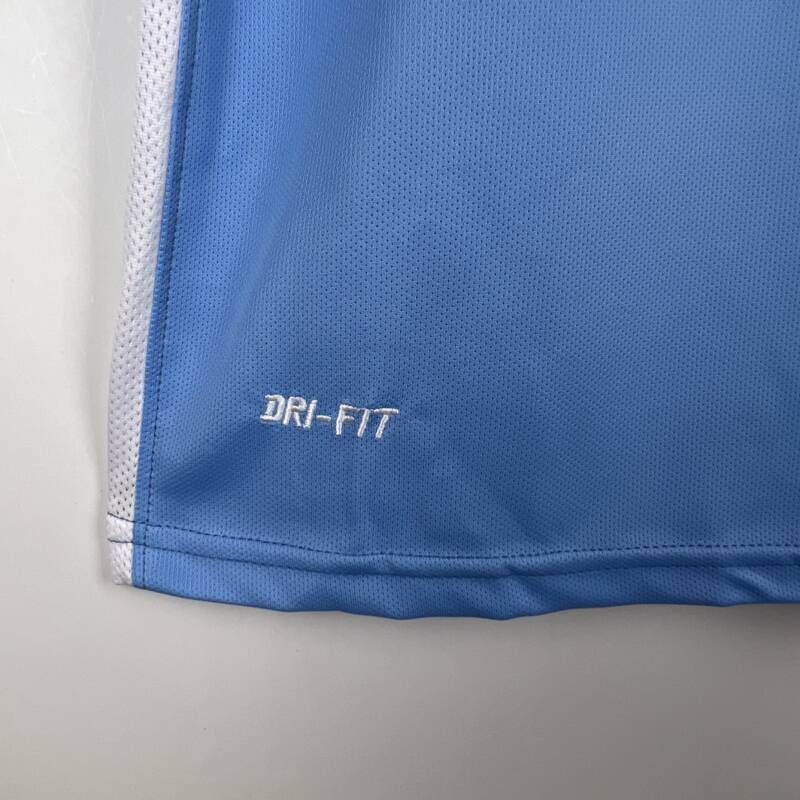 El tenue celeste, omnipresente en la tradición del equipo, toma el centro del escenario, resaltando un cuello de estilo camisa en blanco que evoca la elegancia clásica. Detalles como los bordes de las mangas en color blanco añaden un toque de sofisticación a esta prenda llena de significado.