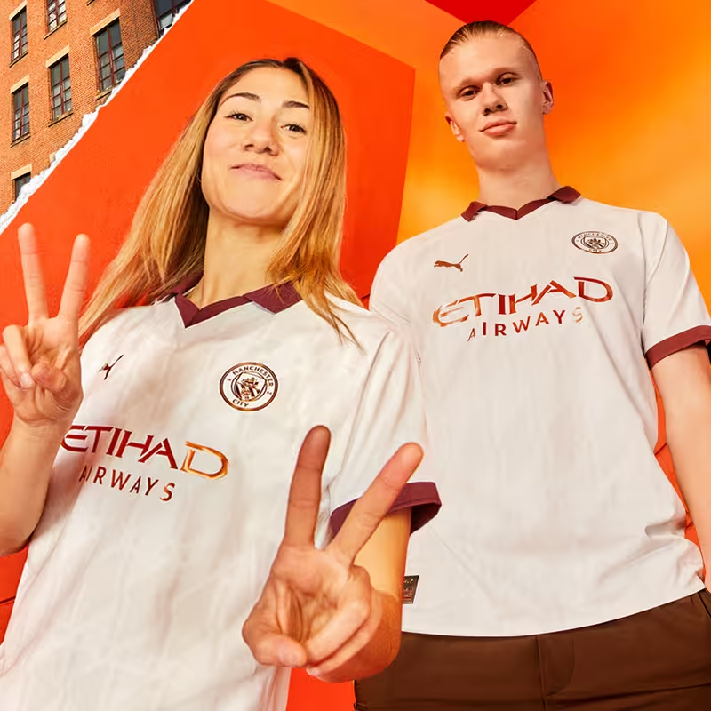 Combina de manera atractiva el marrón y el blanco en un diseño moderno y llamativo. Presenta el logo de la marca, el escudo del Manchester City y la publicidad. Completa el conjunto con un pantalón corto a juego en marrón.
