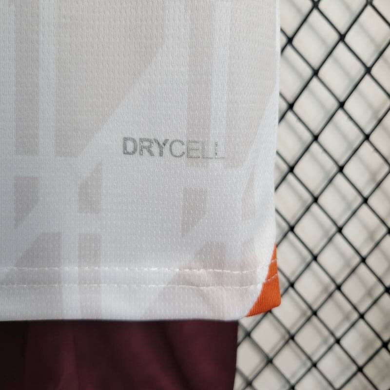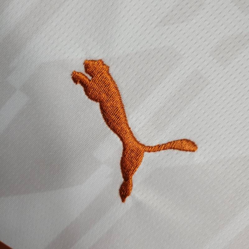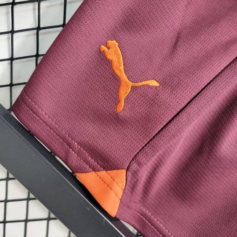 Combina de manera atractiva el marrón y el blanco en un diseño moderno y llamativo. Presenta el logo de la marca, el escudo del Manchester City y la publicidad. Completa el conjunto con un pantalón corto a juego en marrón.
