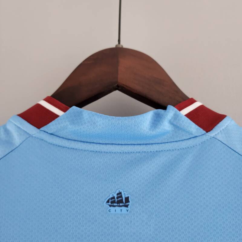 Presenta un diseño impresionante con un vibrante color azul cielo y líneas en granate que resaltan la elegancia y el estilo del equipo, esto hace que destaque en cualquier lugar. Pero lo que la hace aún más especial es la corona ubicada en el interior del torso, que rinde homenaje a Colin Bell, conocido como Colin el Rey.