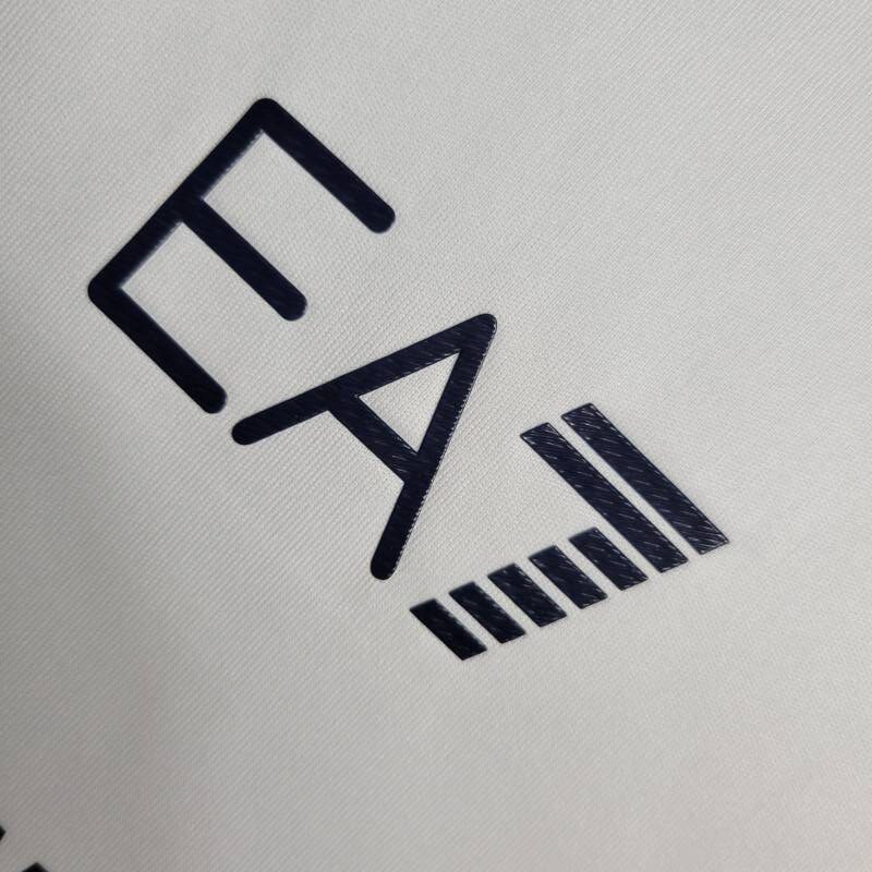 El blanco domina el diseño, complementado por las líneas verticales que rinden homenaje a la bandera de Italia. Lleva el logo EA7, el gran escudo del Napoli y su patrocinador.