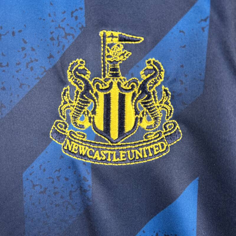 La tercera equipacion Newcastle United es una obra maestra en diseño. Lleva el azul como tonalidad predominante, con un vibrante amarillo que resalta en los ribetes del cuello y los bordes de las mangas. Pero eso no es todo, en la tela se hacen visibles detalles especiales que hacen que esta camiseta sea única. Un efecto chevrones y franjas en celeste, acompañadas por líneas amarillas, adornan la equipación, creando un aspecto dinámico y moderno.