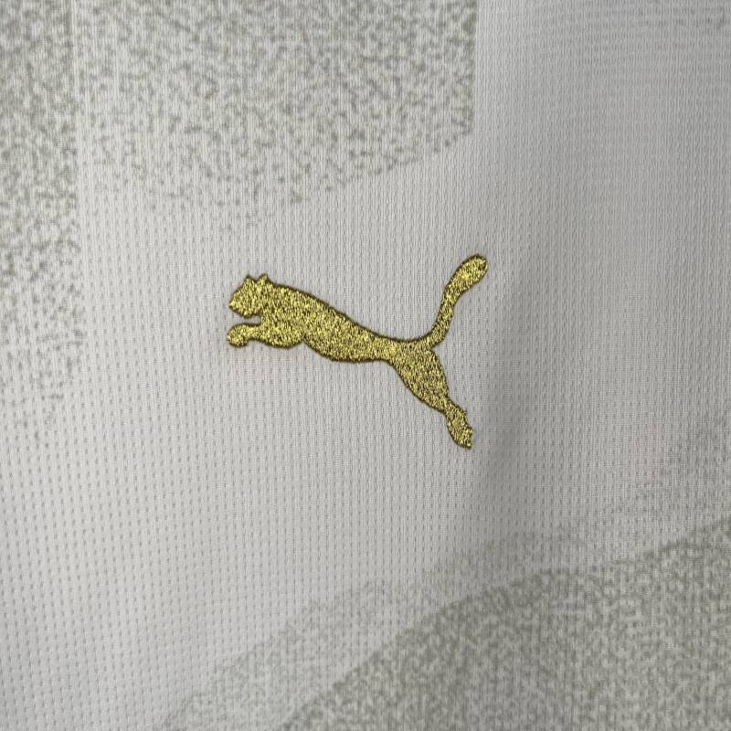 Esta camiseta conserva el blanco icónico que simboliza la pureza y la determinación del equipo, con toques celestes en el cuello y mangas en honor al cielo inspirador. La tela presenta un tenue matiz grisáceo, evocando las piedras calizas características del sur de Francia.