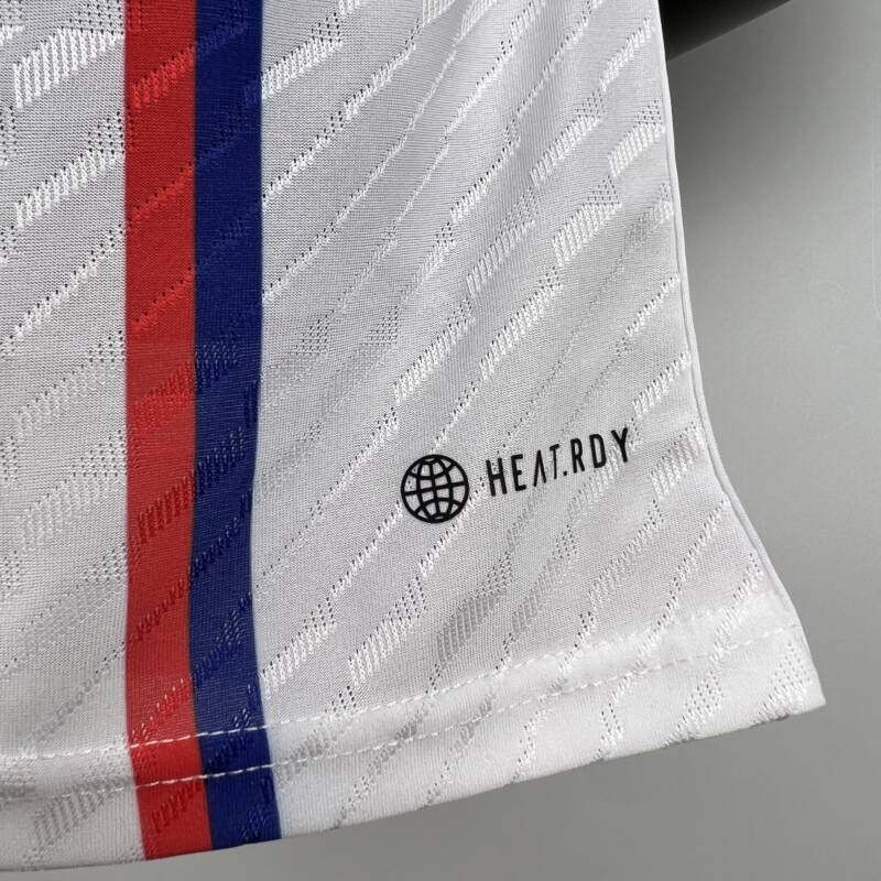 El diseño de la camiseta del Olympique Lyon es impresionante. Predomina el blanco, con detalles en rojo y azul que se combinan de manera perfecta y equilibrada. En el lado izquierdo de la camiseta, hay una línea vertical en rojo y azul, asimismo, aparece está líneas en el cuello que acentúa la figura del jugador y aporta un toque elegante al conjunto. Además, la camiseta presenta tres líneas doradas en el hombro, en la parte delantera, lleva el logo y el gran escudo, también cuenta con el patrocinador en el centro y la autenticidad de la prenda.