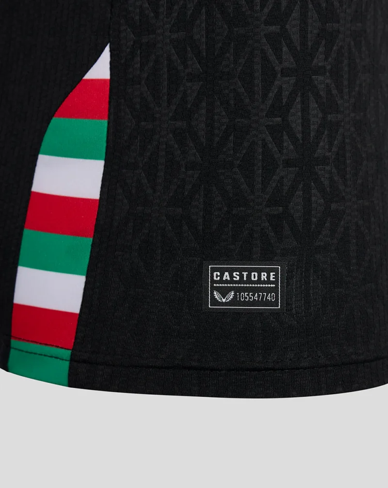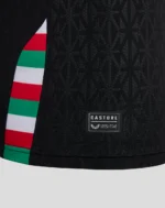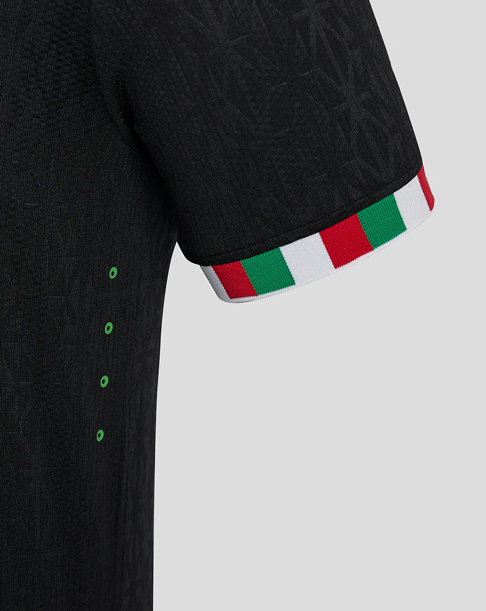 - Diseño imponente: De color negro con llamativos detalles en rojo, verde y blanco en las mangas y el dorsal, aportando una estética única y vibrante. 🖤🔴💚🤍