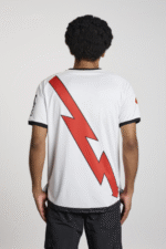 • Franja Roja Icónica: La franja roja 🔴⚡, símbolo de lucha y coraje, es el elemento protagonista de la camiseta, destacando sobre el fondo blanco.