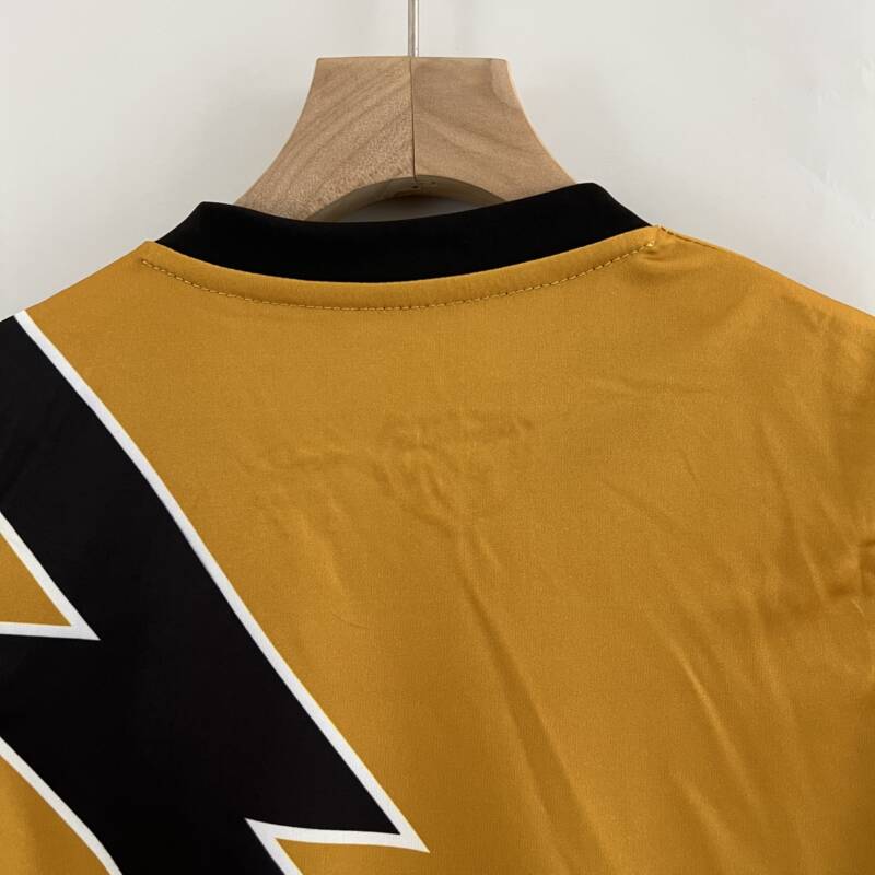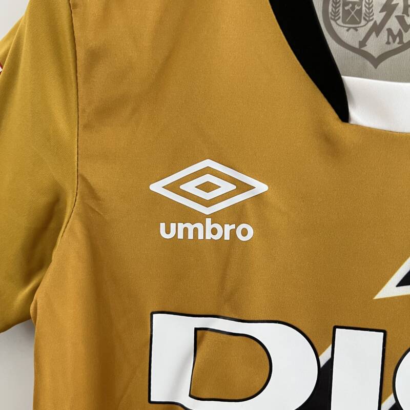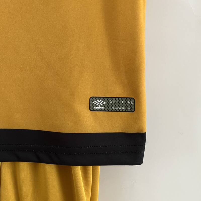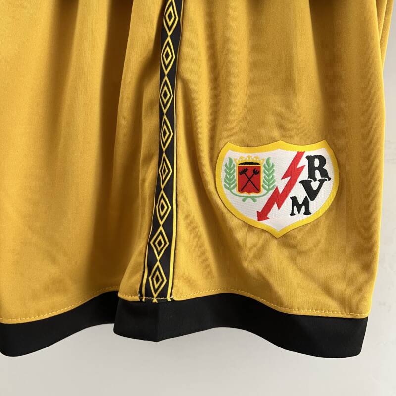 Presenta un color amarillo vibrante, se asemeja más a un cautivador tono mostaza. El rasgo distintivo de esta equipación es un audaz rayo negro que atraviesa la camiseta. La presencia del logo de Umbro, el icónico escudo del Rayo Vallecano y el patrocinador.