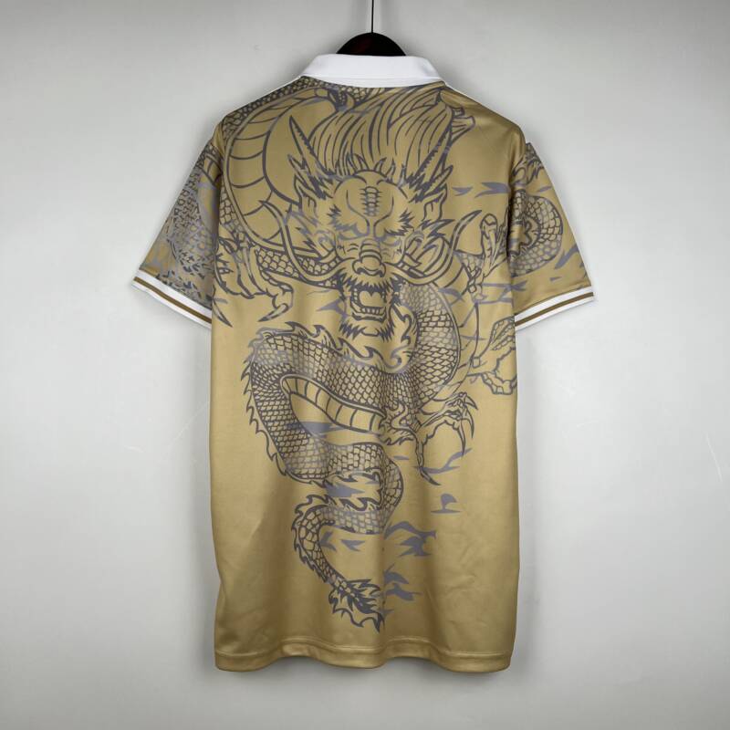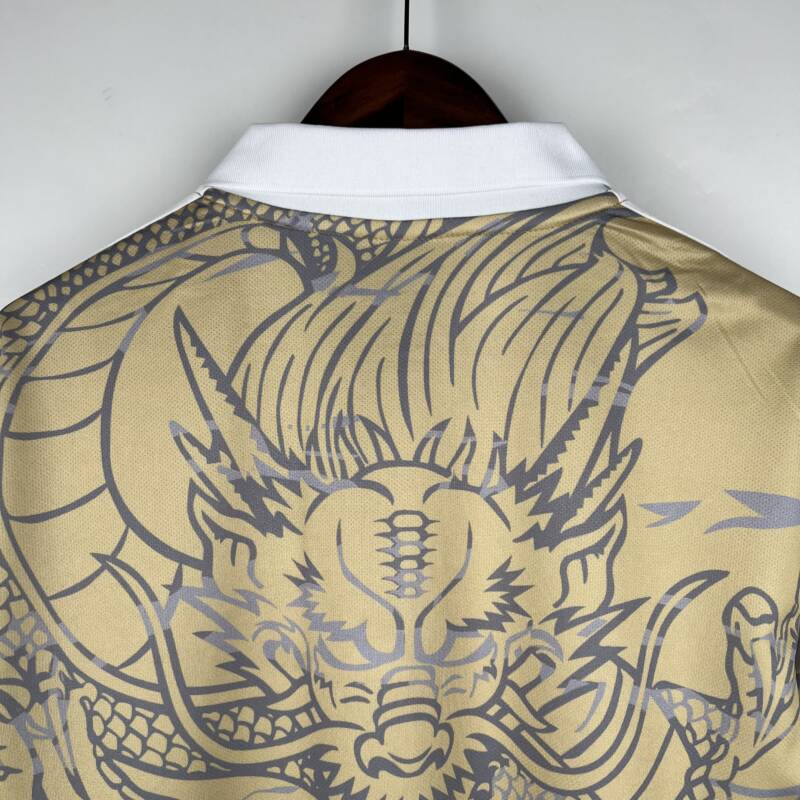 Predomina el dorado y se combina con el blanco en el cuello, los hombros y las mangas, creando una combinación de colores que llama la atención de inmediato. Pero eso no es todo, en el fondo de la camiseta se encuentra un majestuoso dragón que añade un toque de misticismo y poderío. Además, lleva el reconocido logo de la marca, el gran escudo del Real Madrid y el nombre del patrocinador.