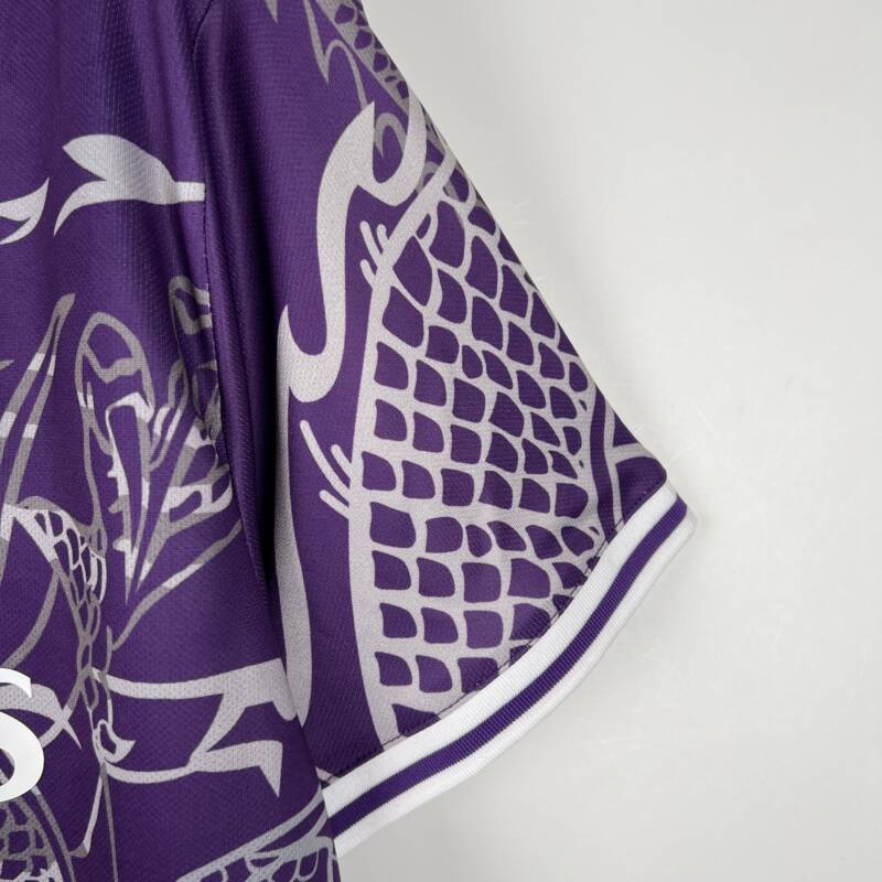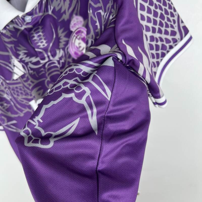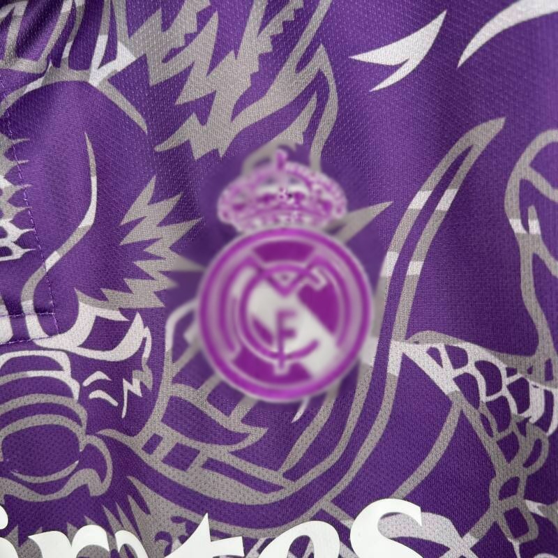 Predomina el morado y combina con el blanco en el cuello, los hombros y las mangas, creando una combinación de colores muy llamativos. Pero eso no es todo, en el fondo de la camiseta se encuentra un majestuoso dragón plateado que añade un toque de misticismo y poderío. Además, lleva el reconocido logo de la marca, el gran escudo del Real Madrid y el nombre del patrocinador.