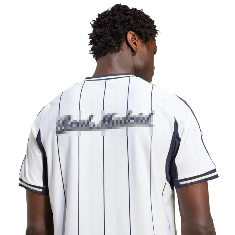 El blanco, color icónico del club, se enriquece con finas líneas verticales azules que aportan profundidad visual y elegancia. El escudo aparece bordado en el pecho con detalles refinados, destacando sin romper la armonía del diseño. La camiseta no incluye publicidad visible, lo que la convierte en una pieza limpia, estilizada y digna de colección.
