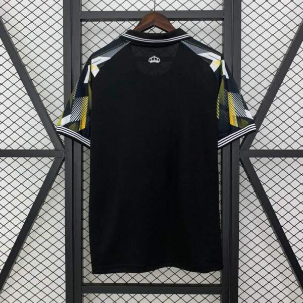 Combina tradición y vanguardia en un diseño que destaca por su base en negro con llamativos gráficos en blanco y toques dorados en el sponsor. Garantiza comodidad, transpirabilidad y rendimiento dentro y fuera del campo.