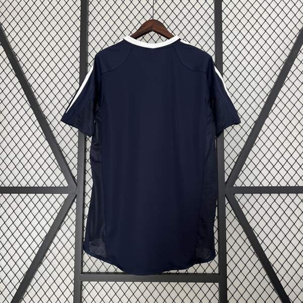 La temporada 2004/05 fue una etapa clave en el Real Madrid, marcada por el cierre de la primera era de los Galácticos. La camiseta de segunda equipación, llegó en un azul marino elegante con detalles en blanco y el patrocinio de Siemens Mobile, convirtiéndose en un emblema de estilo y sobriedad.
