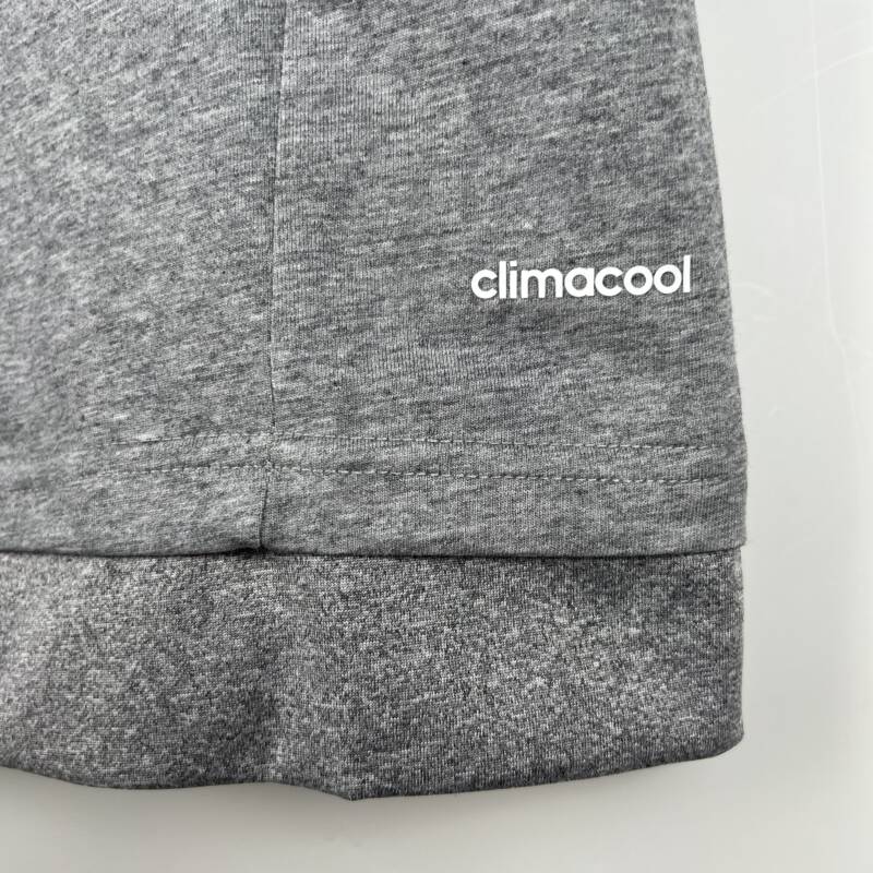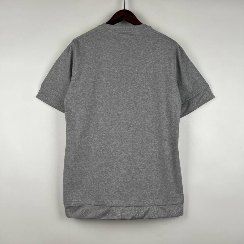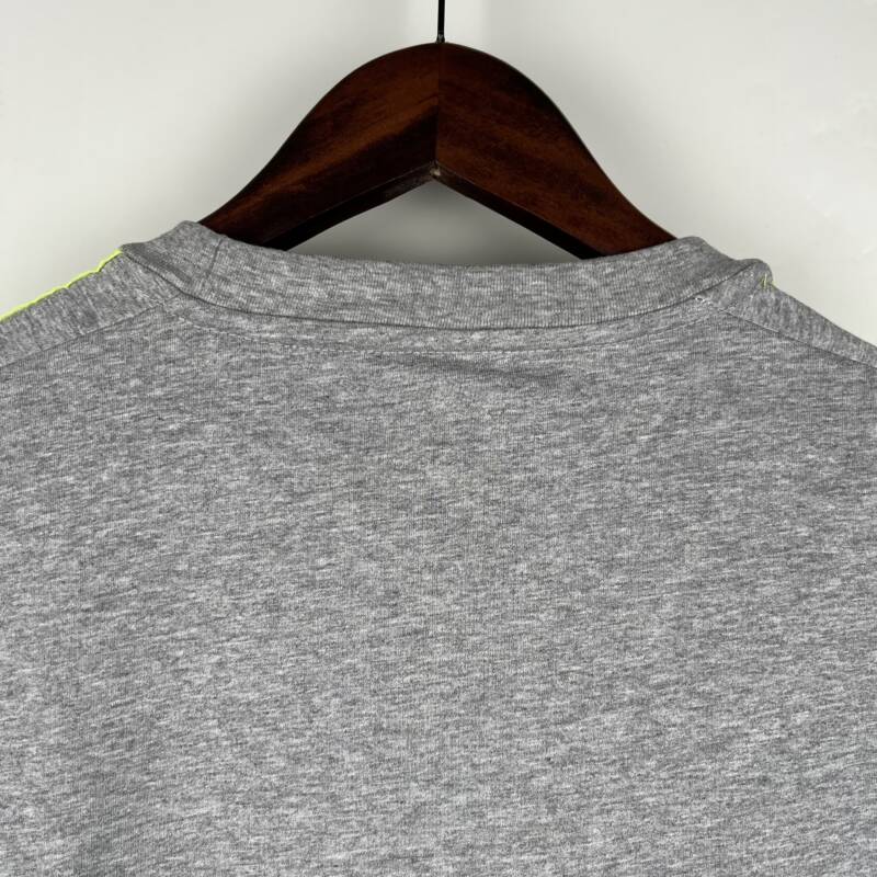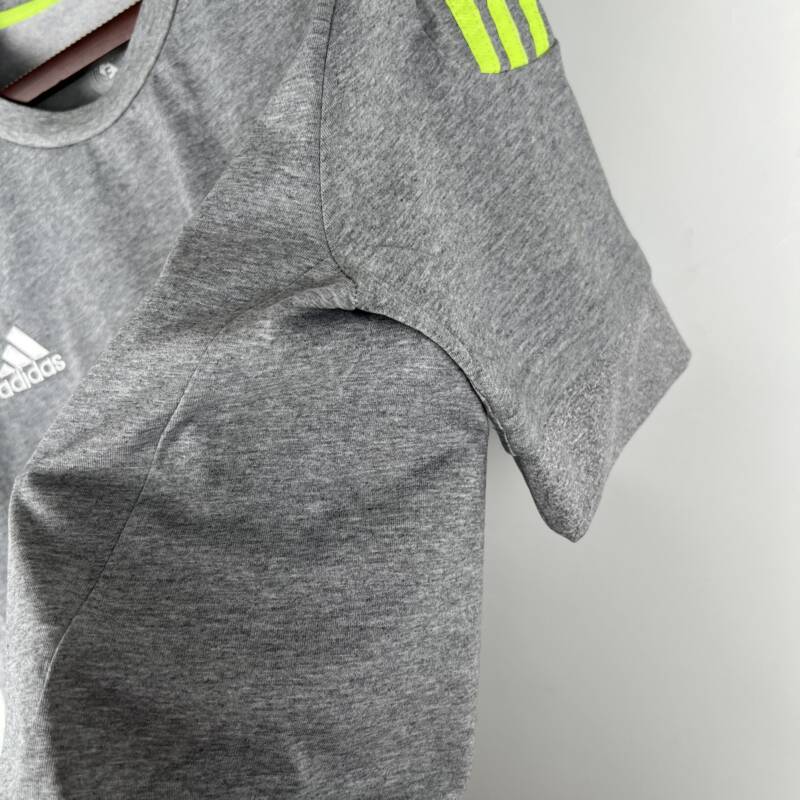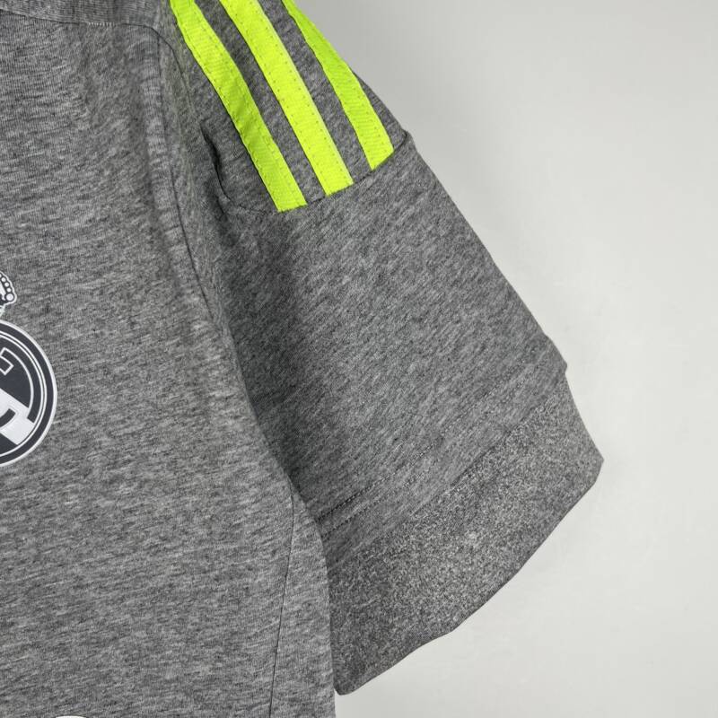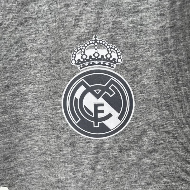 El diseño de esta camiseta retro es simplemente espectacular. Predomina el color gris, lo que le da un toque elegante y sofisticado, y presenta tres rayas verde lima en los hombros, que contrastan perfectamente con el color principal. Además, lleva el icónico logo de la marca y el gran escudo del Real Madrid en el pecho. Esta camiseta es una pieza única y llamativa que no puede faltar en tu colección.
