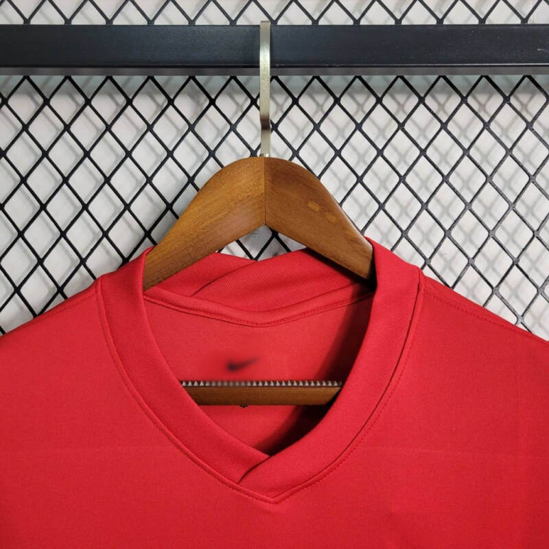 Destaca con su vibrante color rojo, que rinde homenaje a la victoria memorable. El diseño cuidadosamente elaborado resalta el cuello y las mangas, aportando un toque de elegancia y distinción. Lleva el logo, su gran escudo y el nuevo patrocinador.