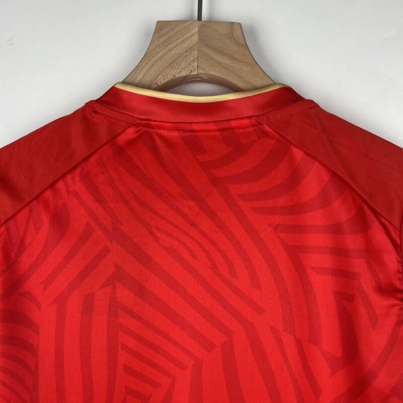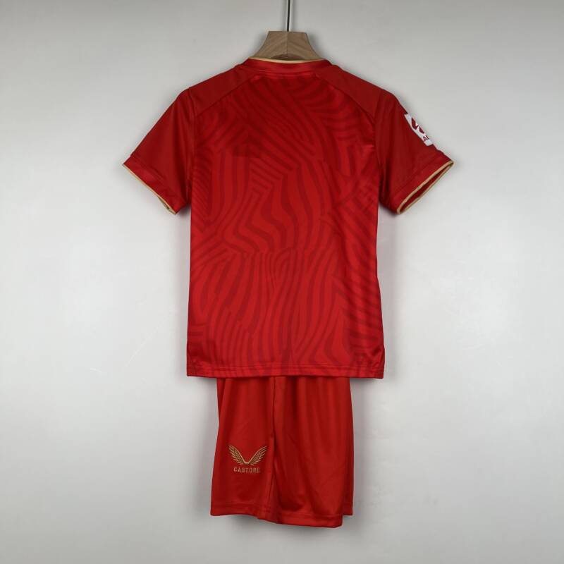 Predominando el rojo intenso y con un llamativo diseño de fondo, esta camiseta captura la esencia del equipo. Además, presenta detalles dorados que bordean el cuello y las mangas. En el pecho, destaca el logo de Castore y el icónico escudo del Sevilla FC, se complementa con el pantalón corto.