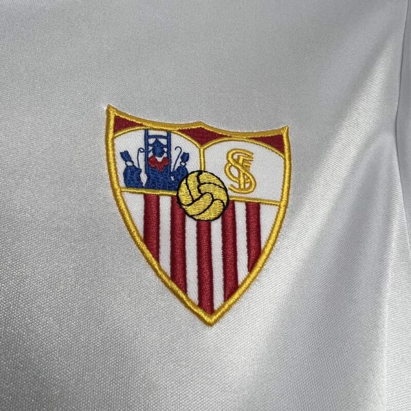 - Diseño clásico en blanco y rojo ⚪🔴: Predomina el blanco, con elegantes detalles en rojo en el cuello y las mangas, un contraste que captura a la perfección el espíritu sevillano de aquellos años.