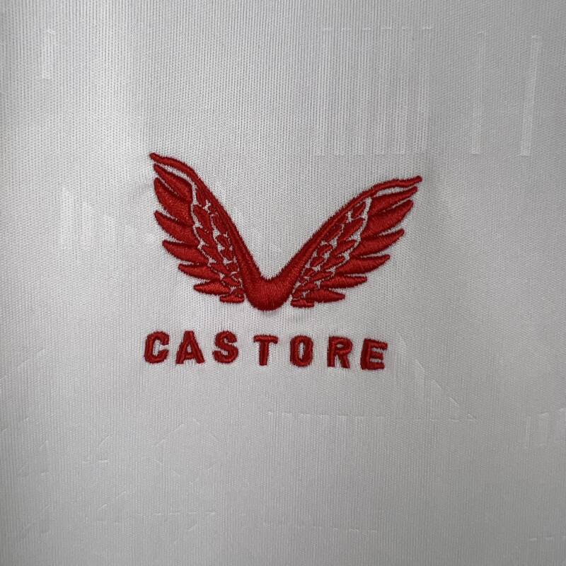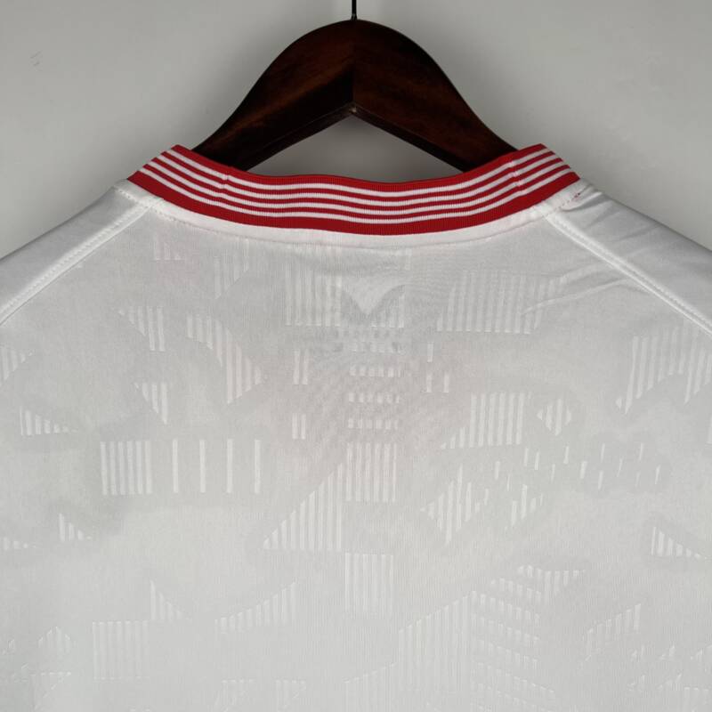 Conservando el blanco como tonalidad principal, esta prenda evoca la rica historia del club mientras abraza el progreso con audaces detalles. El cuello y los bordes en rojo añaden un toque de pasión y fuerza a la camiseta.