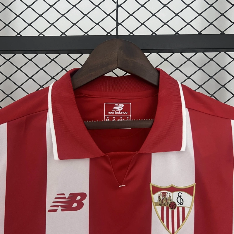El escudo del Sevilla FC luce orgulloso en el pecho izquierdo, perfectamente bordado para ofrecer resistencia y detalle. En el lado derecho, el logo de New Balance, la marca responsable de esta icónica camiseta. -