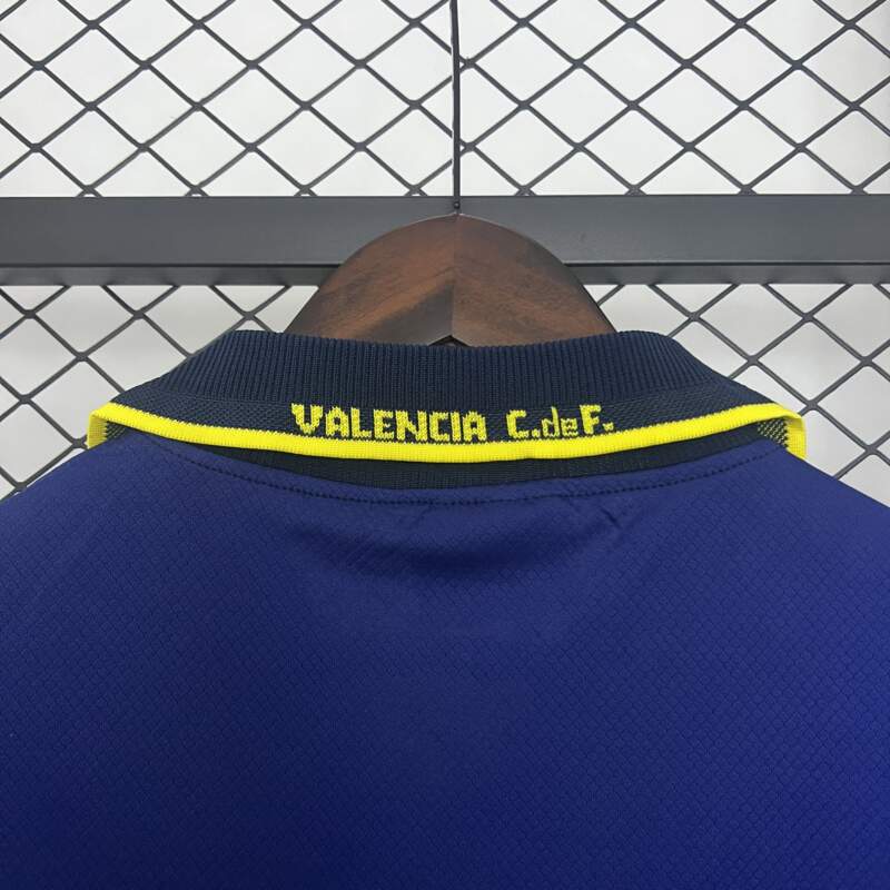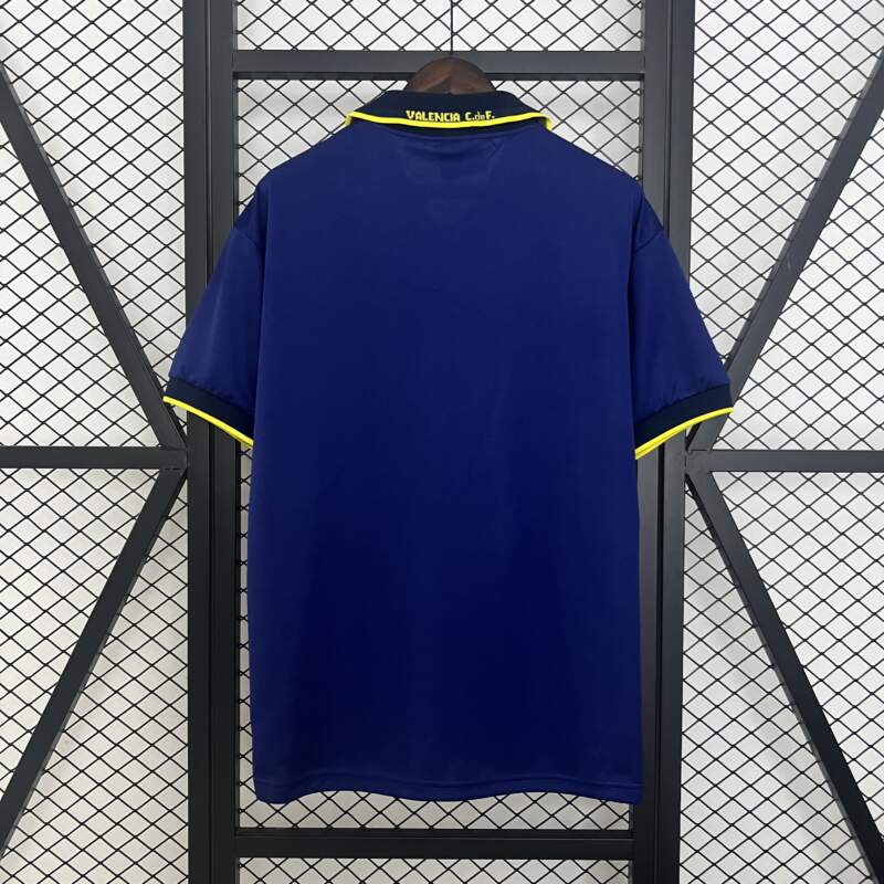 La Camiseta Valencia Segunda Equipación Retro 1996-1997 🦇⚽ es una pieza de colección que te transporta a una de las épocas más emblemáticas del club. Su diseño atemporal en azul marino con detalles en amarillo y rojo es perfecto para los verdaderos fanáticos del equipo ché.